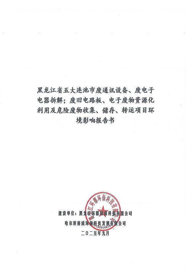 黑龍江省五大連池市廢通訊設備、廢電子電器拆解;廢舊電路板、電子廢物資源化利用及危險廢物收集、儲存、轉(zhuǎn)運項目環(huán)境影響報告書及公眾參與說明